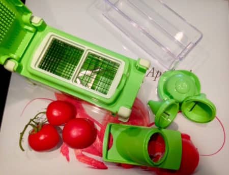Optisch gibt die Küchenhilfe viel her. Mit seinem kompakten und modernen Design sowie der frischen grünen Farbe erleuchtet der Nicer Dicer jede Küche. Viele Teile – viel Platz? Nicht hier, denn der rechteckige Korpus des Gerätes bietet Stauraum für nahezu alle weiteren Zubehörteile. Aufsätze lassen sich kinderleicht in dessen Bauch verstauen und bei Gebrauch wieder entnehmen. Dieses kompakte Design kann auch in der Küche viel Platz sparen, denn wie im kommenden Abschnitt erklärt, soll der Nicer Dicer diverse andere Küchengeräte ersetzen. Zudem besitzt er an allen vorhandenen Ecken Gumminoppen. Diese sorgen dafür, dass das Gerät bei Benutzung rutschfest bleibt und Sie sich nicht verletzen. Also: Daumen hoch für das Design.