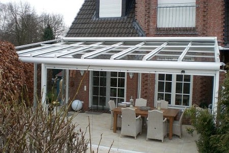 Die Unterbauelemente eines überdachten Sommergartens werden als rahmenlose Falt- oder Schiebeanlagen konzipiert und bestehen komplett aus Glas.