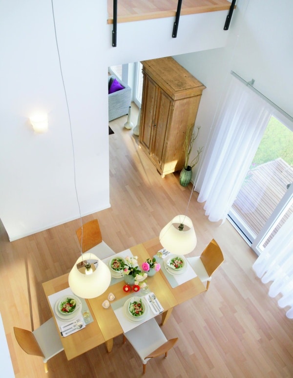 Zusammen mit einem selbstständigen Architekten plante das Paar sein zukünftiges Zuhause bis ins kleinste Detail. Bei der Umsetzung der Entwürfe entschied man sich für SchwörerHaus. Zum einen kannte sich der Architekt mit der Bauweise des Hausbauunternehmens gut aus, zum anderen wohnten Bekannte bereits seit vielen Jahren zufrieden in einem SchwörerHaus. Heute spiegelt das neue Zuhause von Elisabeth Lüders und Bernhard Poxleitner den Wunsch nach moderner Architektur, klaren Formen und Linien wider. Die Umsetzung der persönlichen Vorlieben stellte keinerlei Problem dar, da immer mehr Gemeinden darauf achten, dass architektonische Spielräume auch beim Doppelhausbau gegeben sind und der Einheitslook somit der Vergangenheit angehört.Über zwei Geschosse zieht sich die helle und freundliche Atmosphäre des offenen Wohnens hin. Schiebetüren, Raumteiler und geschickt gesetzte Wandabschnitte schützen bei Bedarf jedoch die Privatsphäre und bieten viele Möglichkeiten, sich zurückzuziehen.