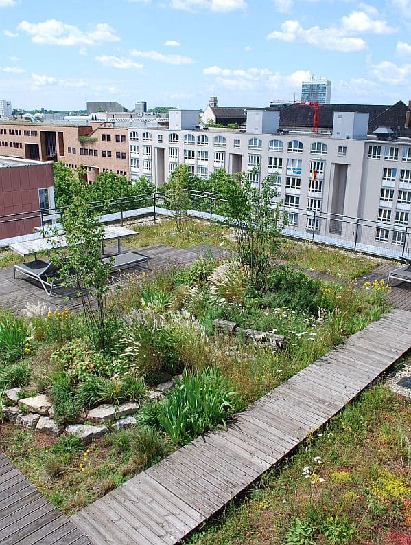 Eine Dachterrasse eignet sich gut für eine Dachbegrünung. Steingartengewächse oder Kräuter für den eigenen Kochtopf sind mögliche Varianten.