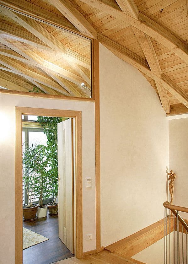 Das Markenzeichen der Bogenhäuser ist ein elegant geschwungenes Bogendach aus Brettlamellen mit filigraner Rautenstruktur, das sich stützenfrei über den vorhandenen Raum spannt. Die Raumaufteilung ist dadurch flexibel, sodass offenes Wohnen ebenso realisiert werden kann wie die Raumerweiterung mit einem Wintergarten, einem Atelier oder einer großzügigen Dachterrasse. Die kühn geschwungene Dachform wurde von ARKUS mit Bedacht gewählt: Bei der individuellen Raumaufteilung kann jederzeit ein Rückbau der Innenwände vorgenommen werden – und zwar ohne in die Statik des Hauses eingreifen zu müssen. Deshalb ist das frei tragende Bogendach auch für größere Spannweiten wie Sport- oder Reithallen hervorragend geeignet. Die gewölbte Form vermittelt Harmonie und natürliches Wohlempfinden und steht für eine moderne Architektur. Dies kann noch gesteigert werden, wenn die oberen Anschlüsse der Wände zum Bogendach hin verglast werden.